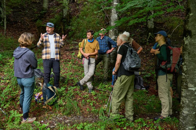Insgesamt 14 Personen erkunden an der vom Forum Wildnis Schweiz zusammen mit der Samina Stiftung organisierten Exkursion das Saminatal. Viele beschäftigen sich beruflich mit Natur und Naturschutz und interessieren sich für Wildnis und freie Naturdynamik. Im Vordergrund steht, das Saminatal kennenzulernen und die Prozesse rund um das Errichten eines Wildnisgebiets der Kategorie 1b zu verstehen. Die Samina Stiftung, deren Stiftungsrat unter anderem Prinz Nikolaus von und zu Liechtenstein ist, der Bruder des Fürsten, strebt den grenzüberschreitenden Erhalt des Samina- und Galinatales als grösserflächiges Schutzgebiet durch Errichtung eines Wildnisgebiets an. Der Untersuchungsperimeter für die erstellte Naturmonographie beträgt 2’670 Hektar.